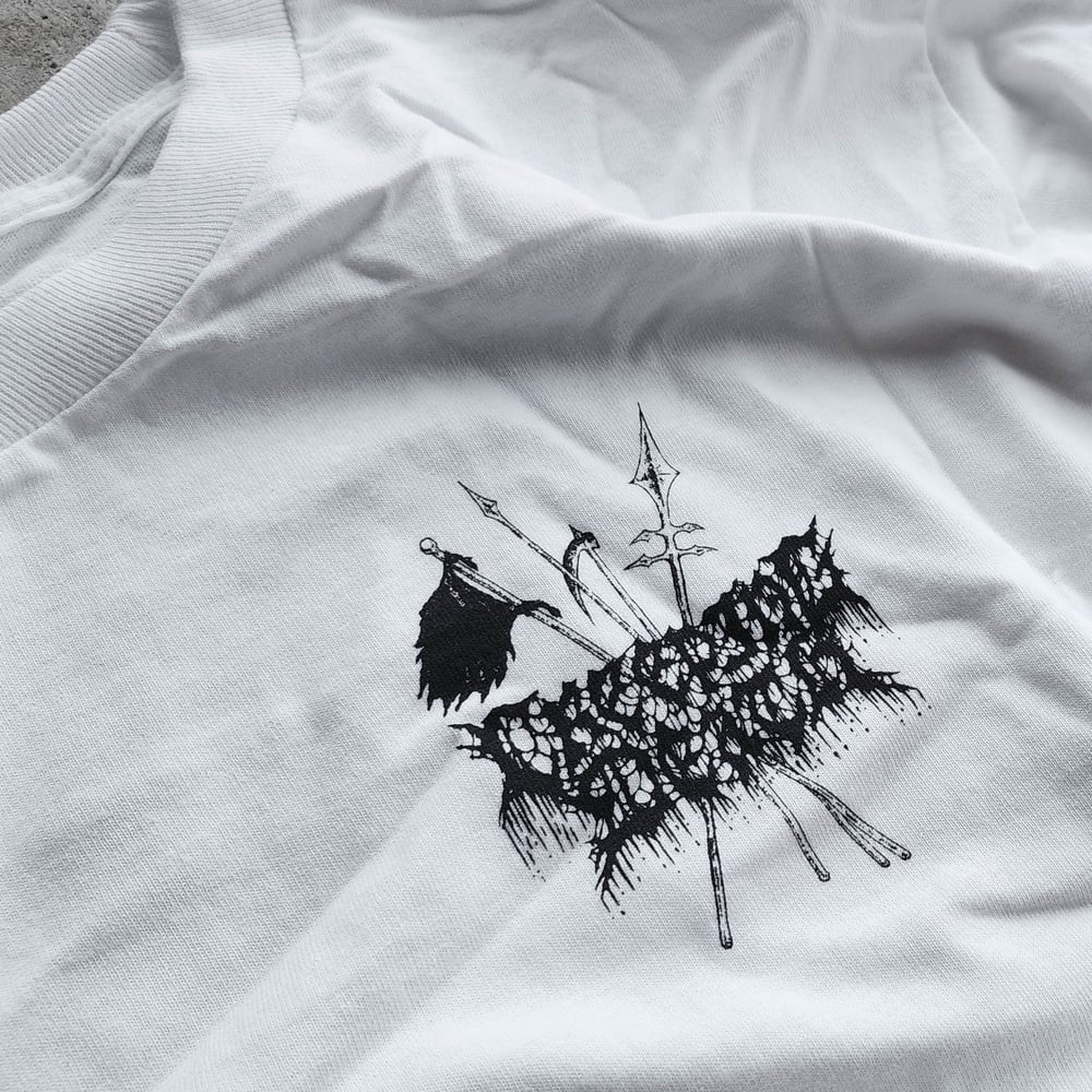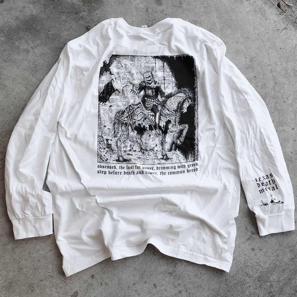 3-sided white long sleeve tee. Subtle Creeping Death pocket print, lower sleeve print, and full back print featuring "The Common Breed" graphic on Gildan 1304 Heavyweight Cotton.